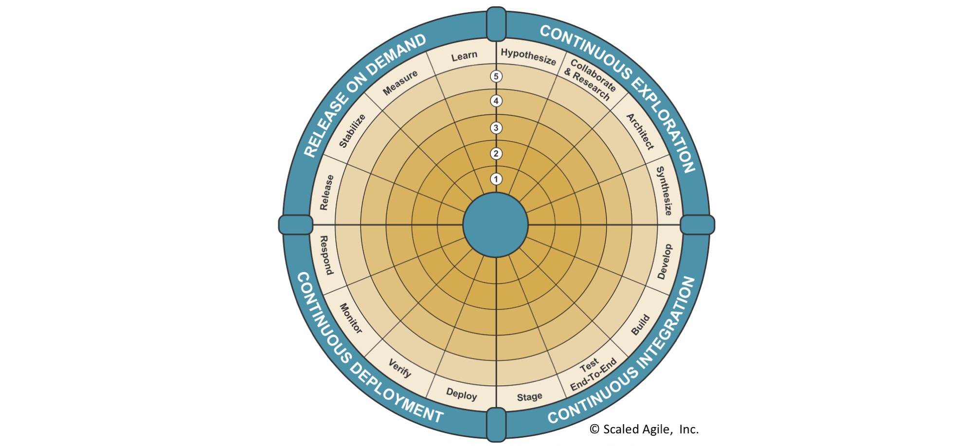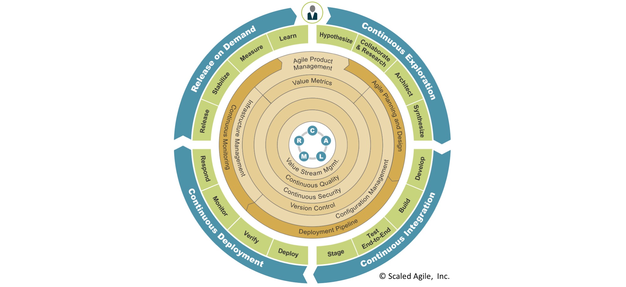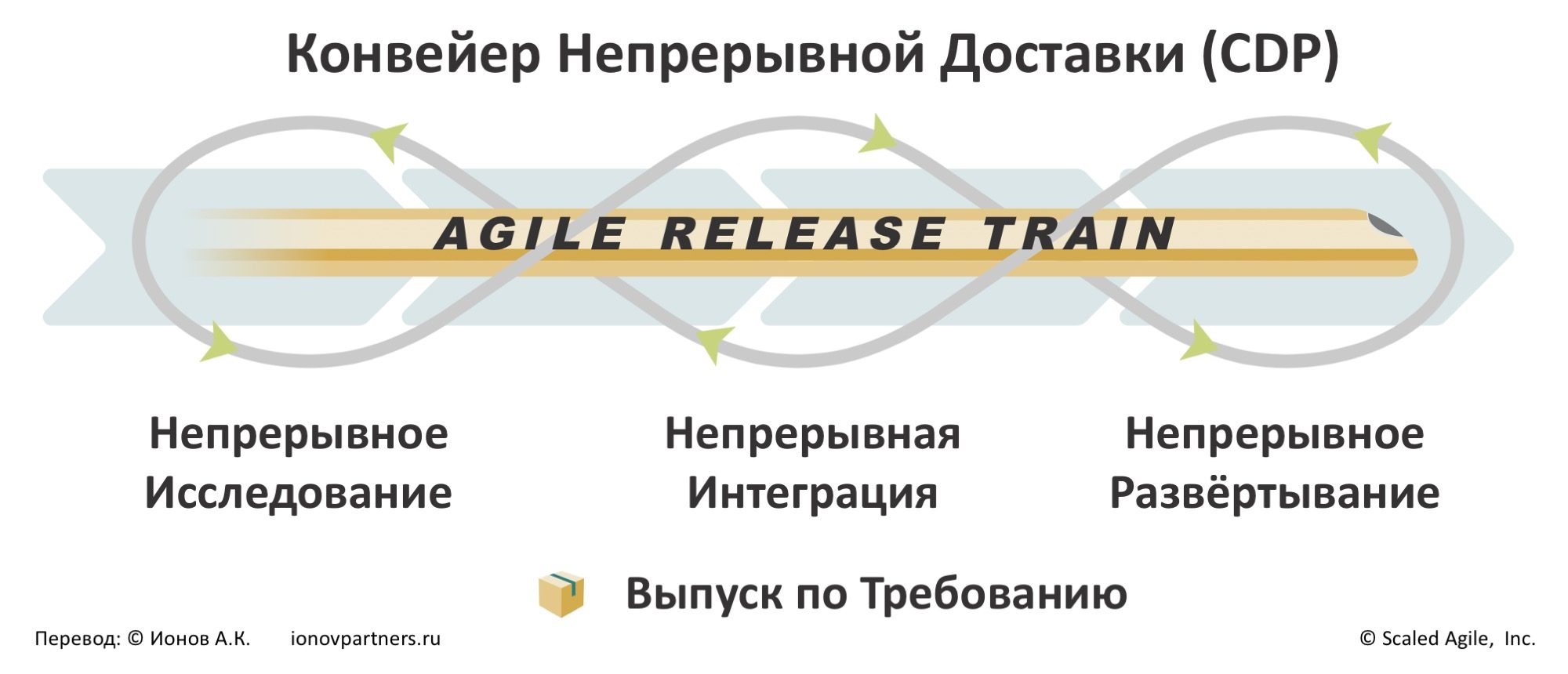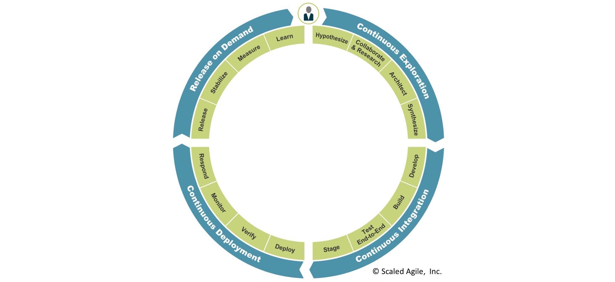 На рисунке 3 показано, что в SAFe Конвейер Непрерывной Доставки рассматривается как замкнутый цикл, поощряющий быстрые, низкорисковые эксперименты и непрерывное обучение с целью понимания потребностей, привычек и предпочтений клиентов.