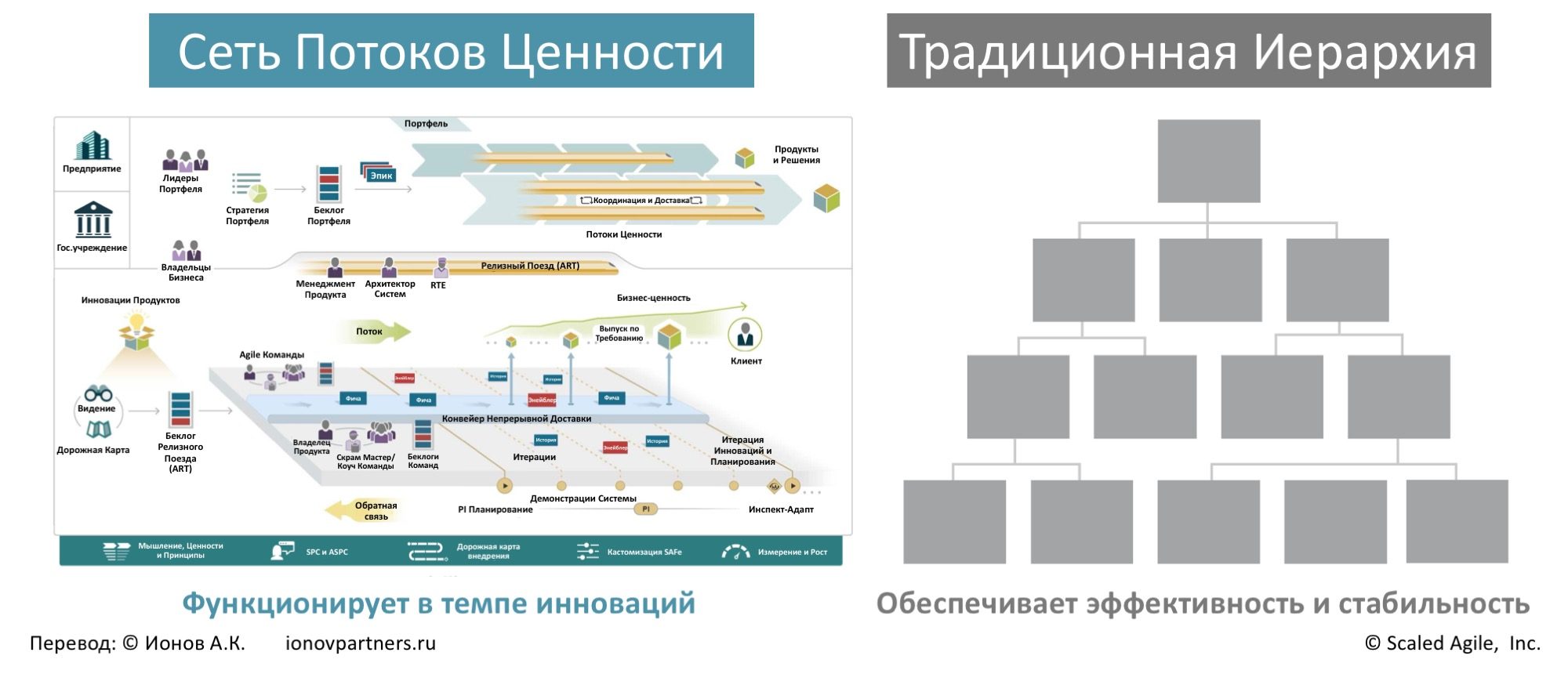 Существующая иерархия, сотрудники и менеджмент продолжают выполнять свои функции и остаются на своих местах. Вместе с тем SAFe формирует вторую виртуальную операционную систему, организованную вокруг Разработческих Потоков Ценности (Development Value Streams, DVS), а не функциональных силосов (отделов), создавая тем самым предпринимательскую сеть.