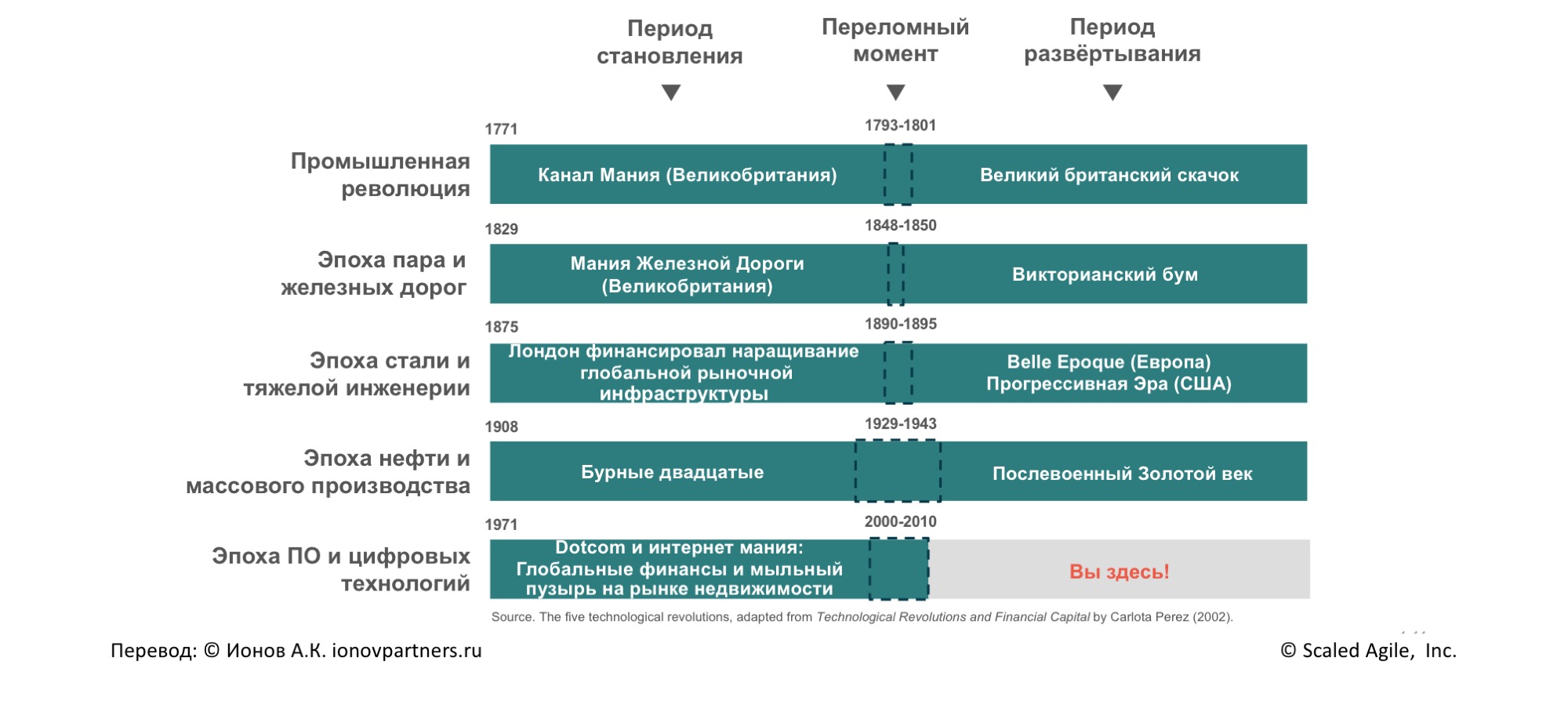 Её исследование начинается с «Индустриальной Революции», далее следует «Эпоха пара и железных дорог», «Эпоха стали и тяжелой инженерии», «Эпоха нефти и массового производства», и сейчас мы находимся в «Эпохе Программного Обеспечения и Цифровых Технологий», как показано на Рисунке 1.