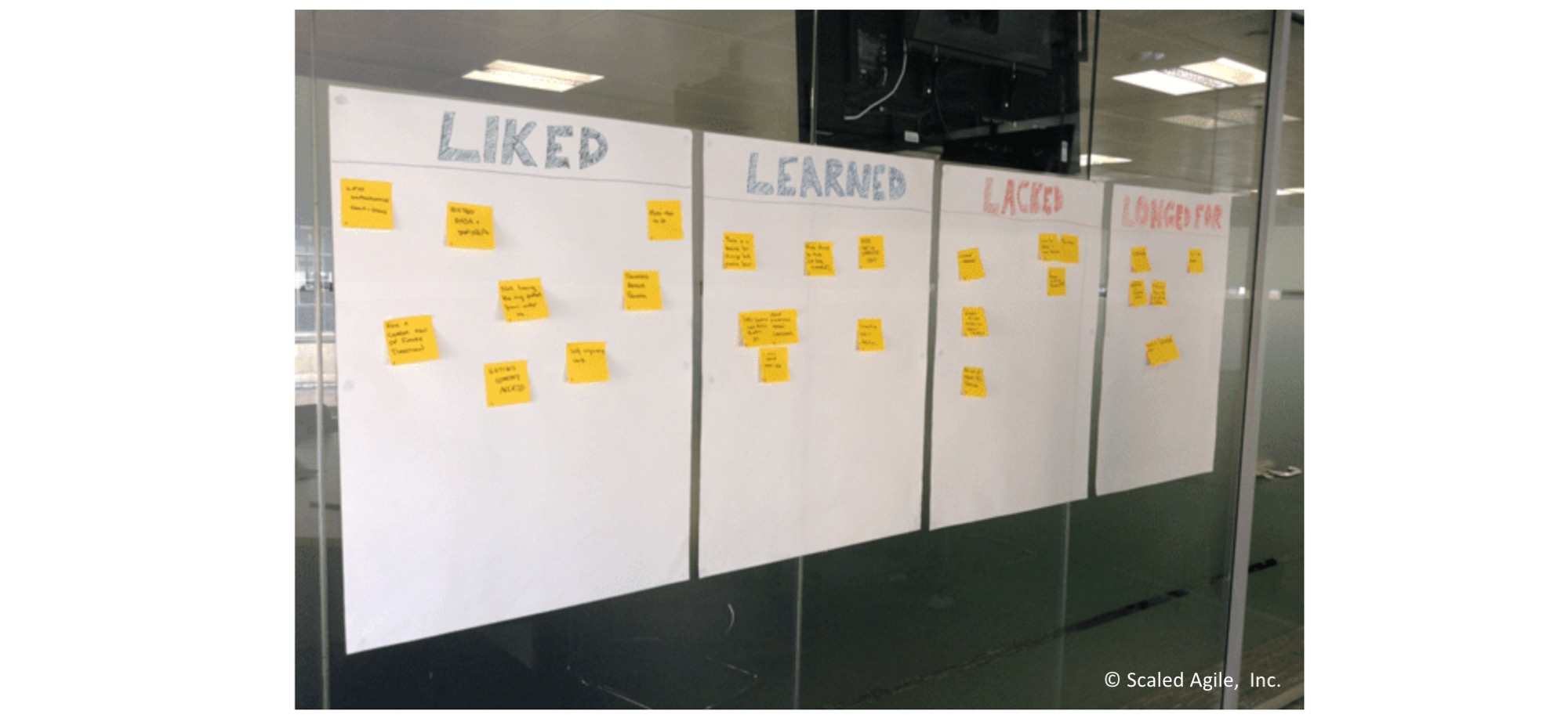 При необходимости можно расширять набор вопросов, группировать их по темам и менять формулировки. Например, использовать формат 4Ls (Что понравилось (Liked) – Чему научились (Learned) – Чего не хватило (Lacked) – Чего хотелось бы (Longed for)), как показано на рисунке 2.