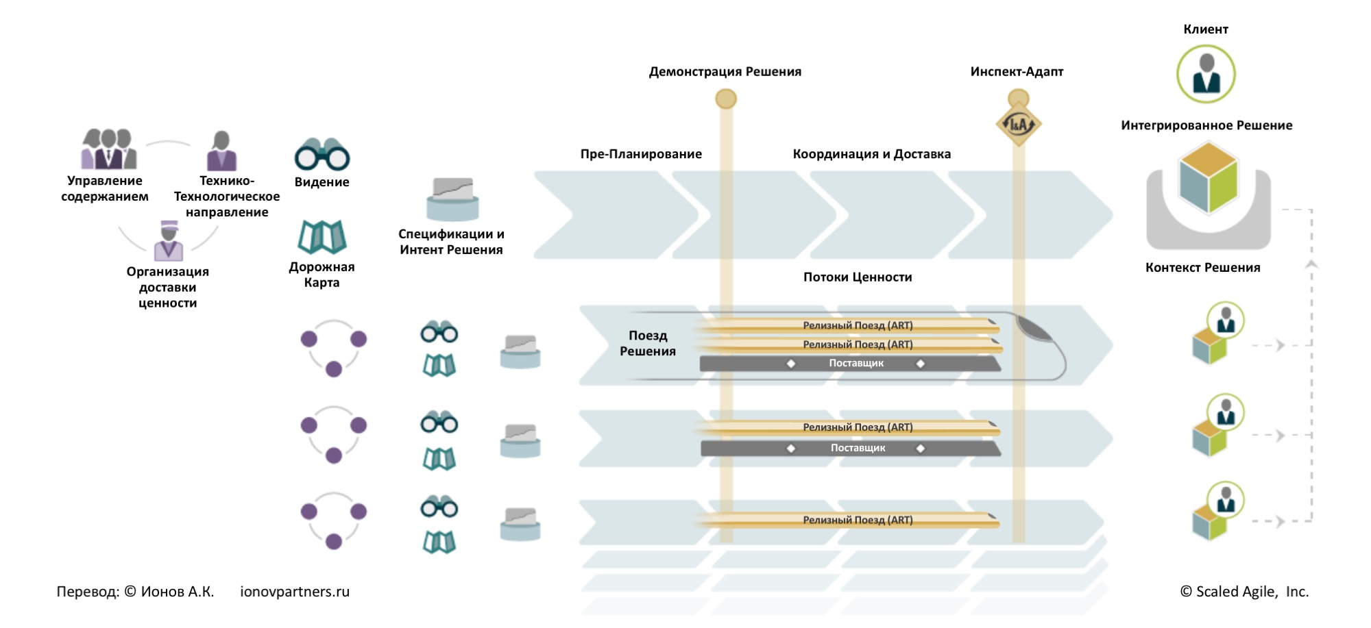 Эта дисциплина SAFe сосредоточена на решениях, создание которых требует участия множества потоков создания ценности и Релизных Поездов (Agile Release Trains, ART), между которыми необходимо организовать согласованную доставку. Для простоты различные сценарии масштабирования объединяются под общим понятием «крупные решения» – независимо от того, создают ли, например корпоративное программное приложение всего 6 взаимосвязанных Релизных Поездов (Agile Release Train, ART) или целых 60 Поездов совместно доставляют киберфизическое решение, такое как оборонная система, спутник или автономное транспортное средство.