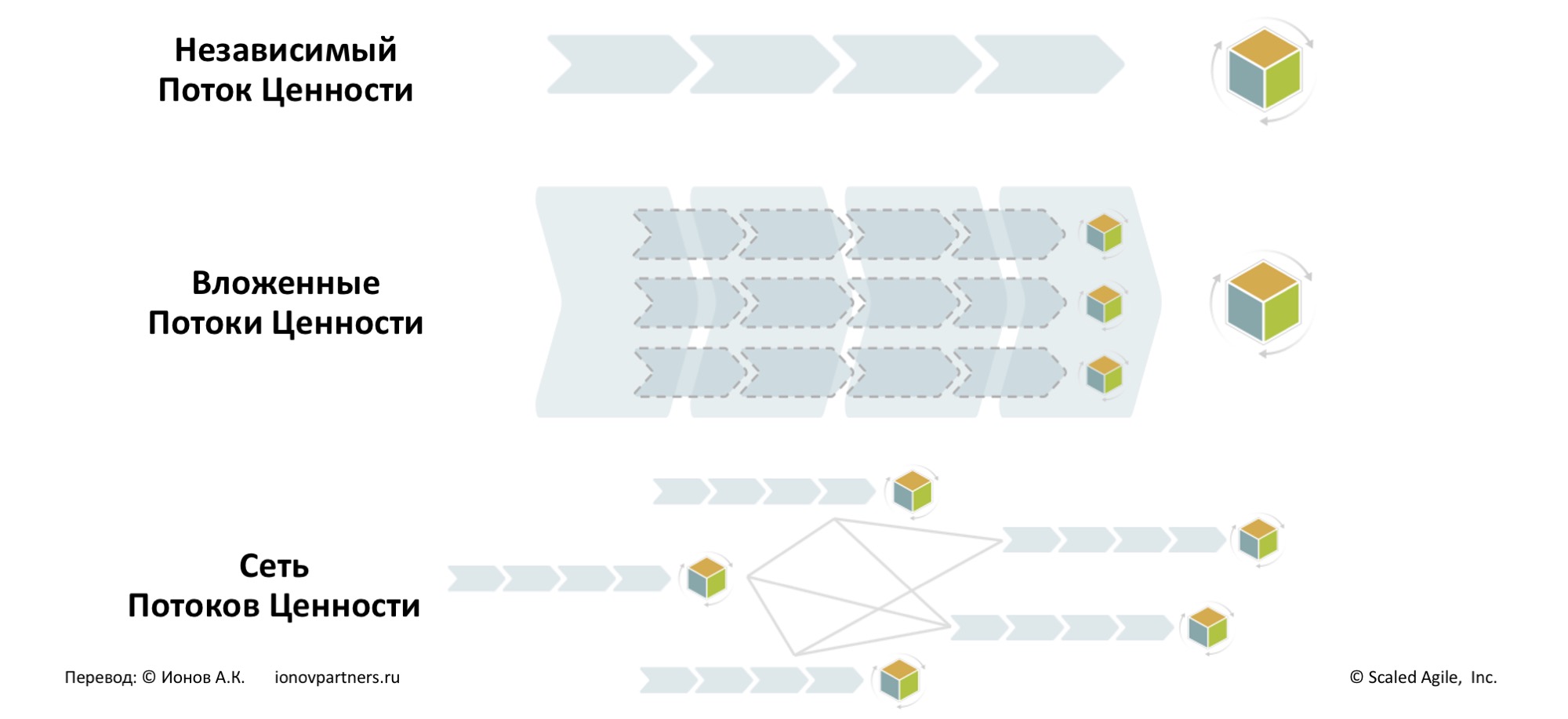 Сетевая организация потоки создания ценности – несколько разработческих потоков ценности, которые должны сохранять со-направленность для доставки различных взаимосвязанных решений.
