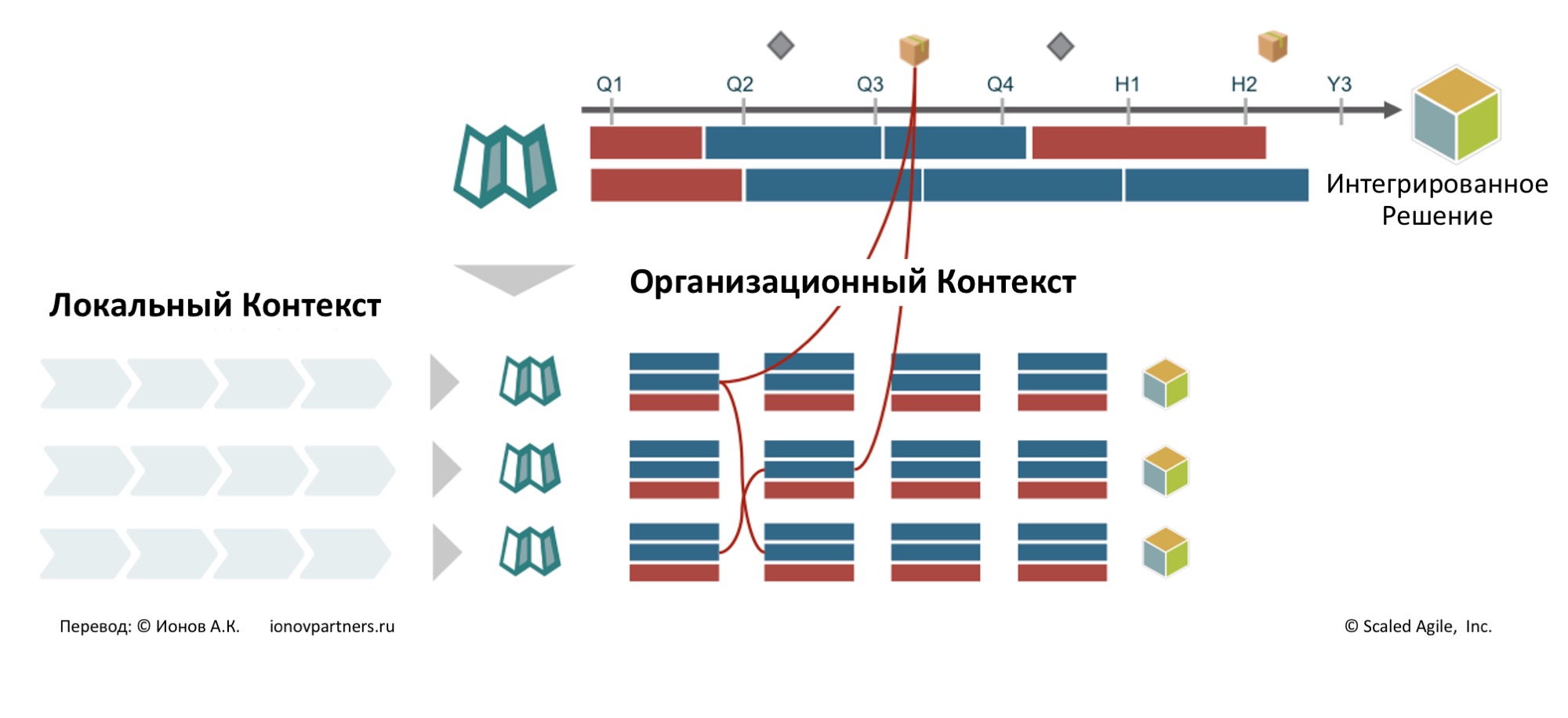 - отражают зависимости между потоками создания ценности и дорожной картой более крупного интегрированного решения (показаны красными линиями на рисунке).