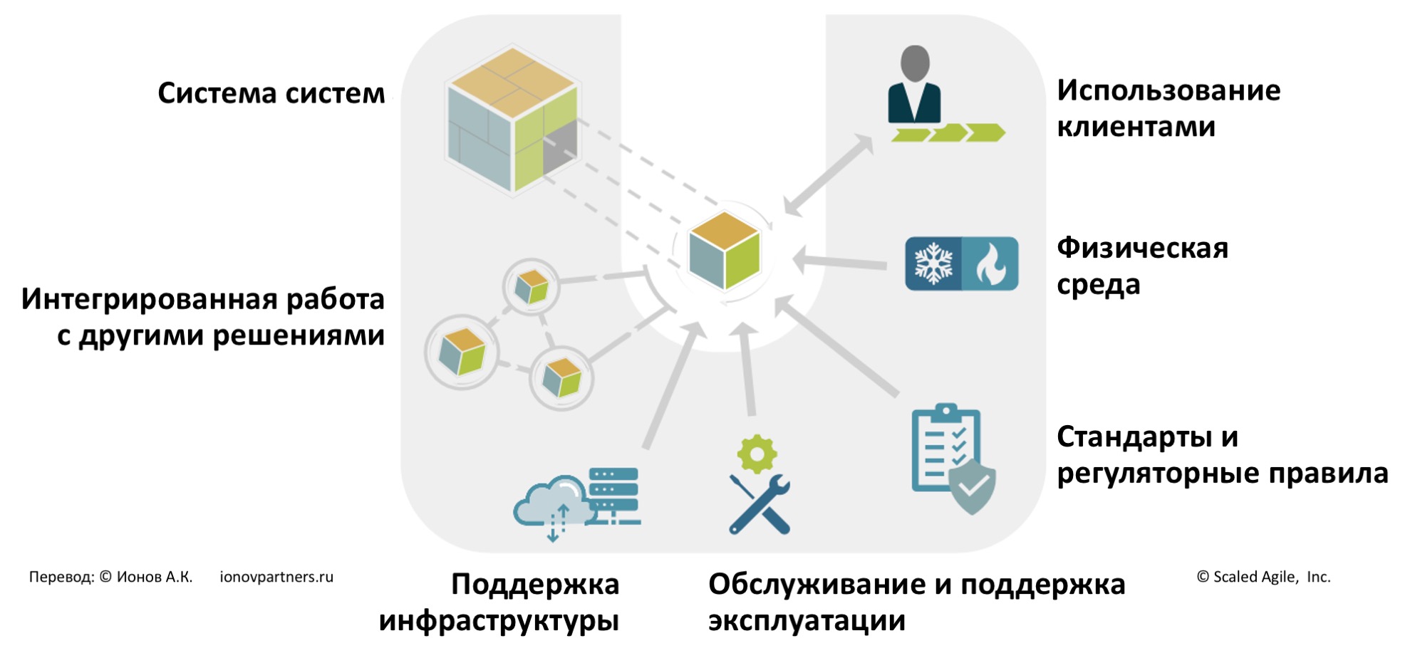 Крупные решения часто требуют наличия других решений для их проектирования, тестирования, развёртывания, производства и эксплуатации. Например, киберфизические системы нередко предполагают создание значительного объёма испытательного и производственного оборудования параллельно с самим решением. Крупные ИТ-системы также требуют существенной инфраструктуры для эксплуатации. Контекст решения, показанный на рисунке 5, отражает эти аспекты. Среда, в которой функционирует решение, влияет на все элементы его разработки, включая интент решения и проектирование, приоритеты разработки, реализацию и тестирование решения, управление релизами и многое другое.