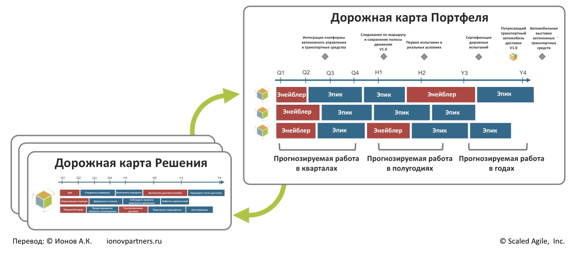 Так как дорожная карта портфеля может охватывать годы, долгосрочные инициативы требуют Agile подходов. Рекомендуется использовать дорожные карты со скользящим горизонтом (rolling‑wave) вместо планов на фиксированный промежуток времени. Lean‑Agile лидеры должны понимать, что каждое жёстко зафиксированное долгосрочное обязательство снижает стратегическую гибкость организации.