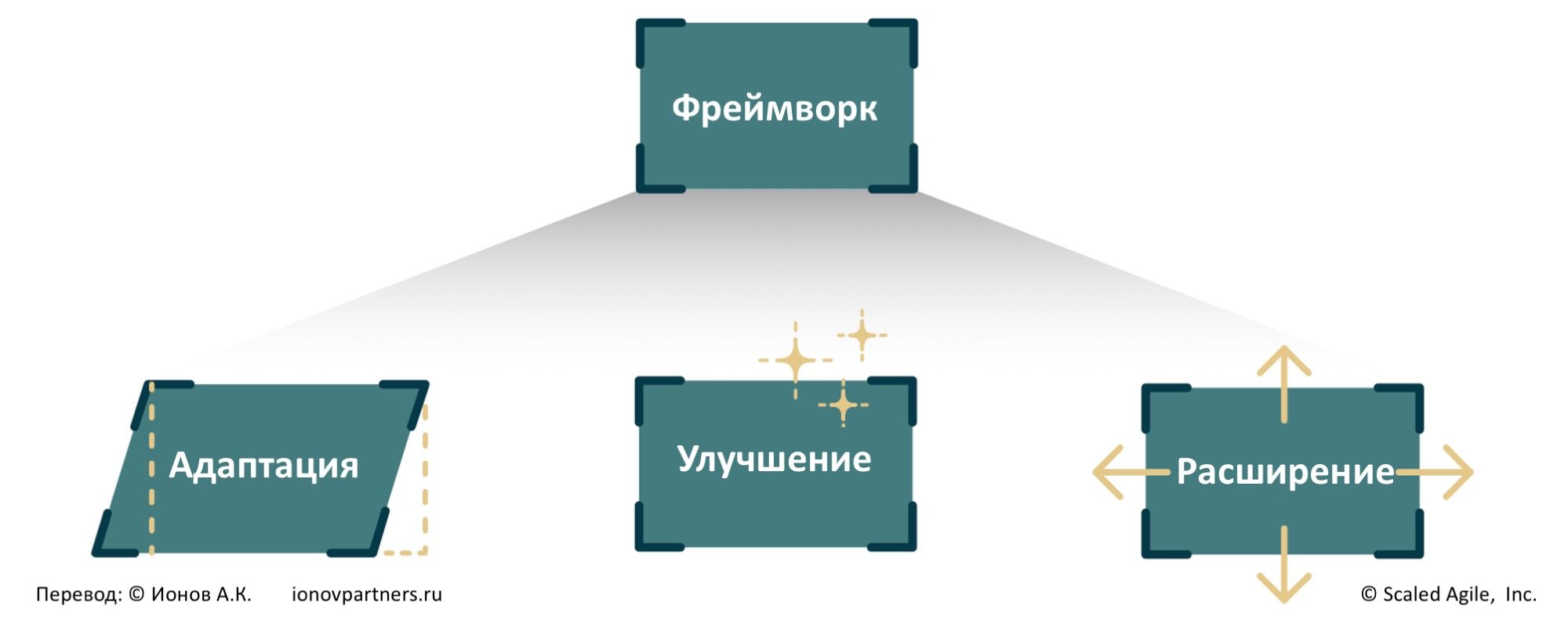 За годы практики организации по-разному кастомизировали SAFe. Однако, как показано на рисунке 2, эти модификации обычно сводятся к 3м типам: адаптация, улучшение или расширение.