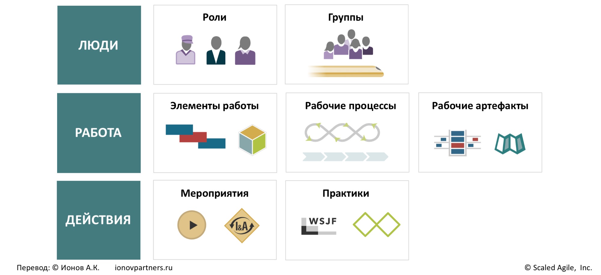 С учётом сказанного, возникает следующий вопрос: какие элементы SAFe можно кастомизировать? Чтобы ответить на этот вопрос, важно понимать, что любую систему работы можно свести к трём ключевым категориям:
