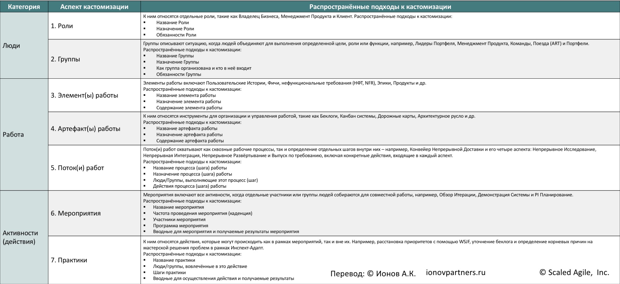 Термин «индивидуальная настройка (кастомизация)» выбран намеренно, чтобы отличать его от «конфигурирования». Многие элементы SAFe изначально рассчитаны на обязательное конфигурирование. Ниже — несколько примеров: