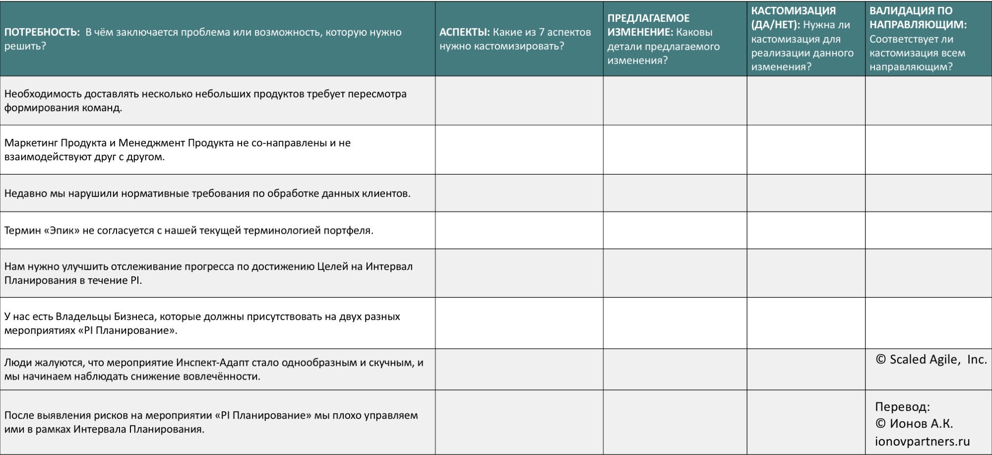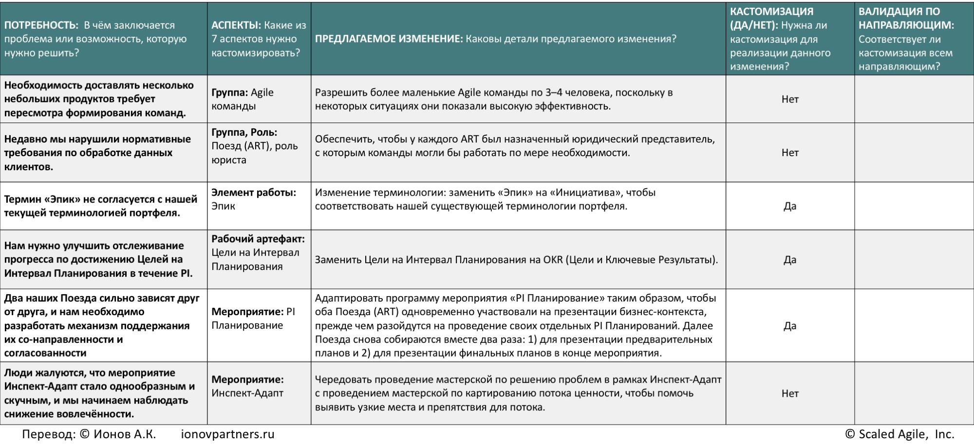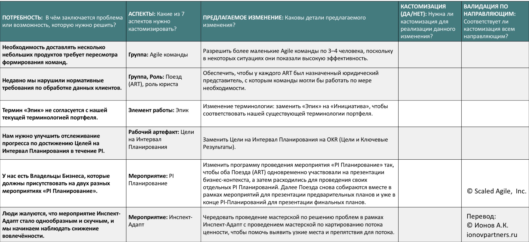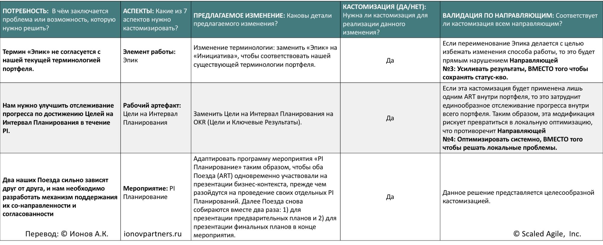 - Определить, требует ли каждое предложенное изменение фактической кастомизации SAFe;